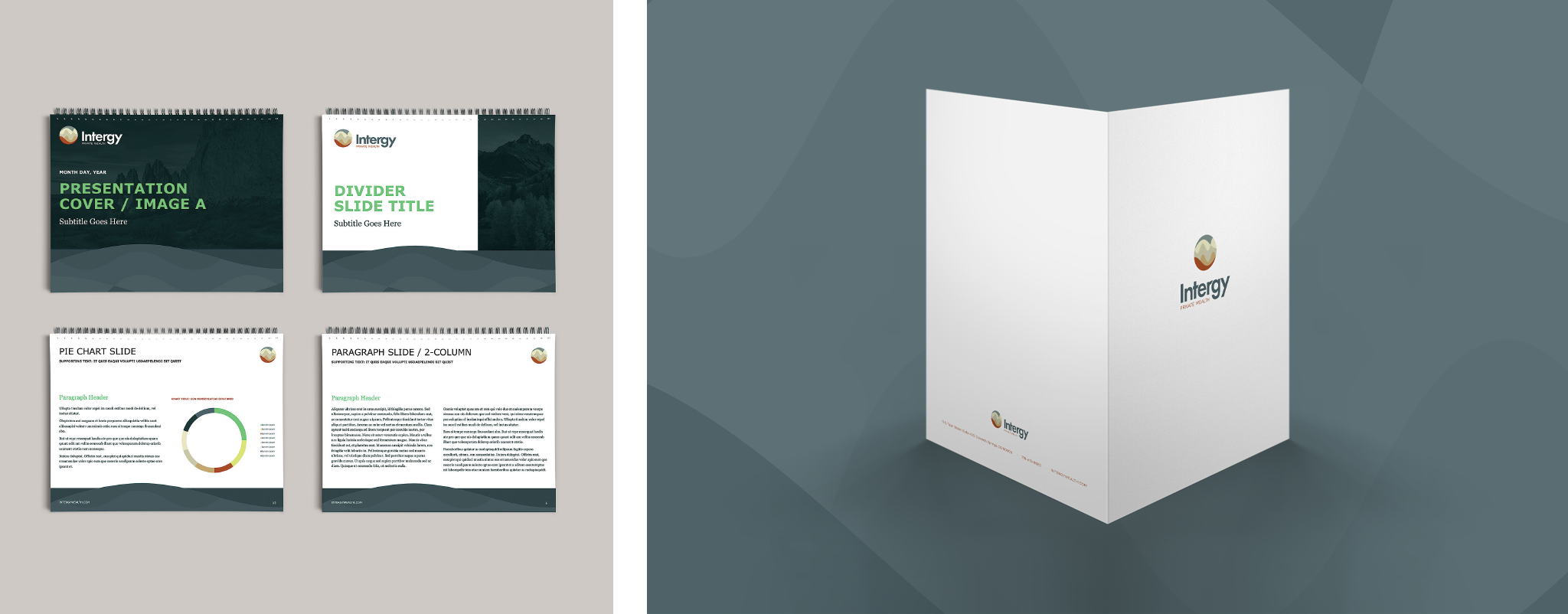 We partnered with Dynasty Financial Partners to create their brand, the cornerstone of which is the firm’s name: Intergy is a portmanteau of Intuition and Energy. Much of Intergy Private Wealth’s visual identity draws inspiration from their base in Colorado Springs—earth tones nod to the mountains that define the local geography and establish a sense of strength and integrity. The mountain motif carries into their logo—fluid lines cross to form a modern, impressionist landscape that evokes the emotions of watching a sunset. A sans-serif typeface with custom ligatures creates a friendly sense of welcome for the name ‘Intergy’ while an all-caps ‘Private Wealth’ provides a strong foundation for the entire logo. We extended these visual elements to the website, print marketing collateral and pitch book, all of which feature our written content, as well.